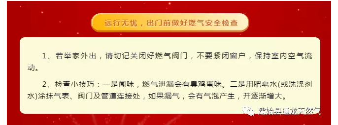 友情提醒 錯(cuò)峰出行 又或者準(zhǔn)備在家好好休息? 無(wú)論你選擇哪種“度假“方式 小編提醒您 享受假期的同時(shí) 也請(qǐng)不要忽視燃?xì)獍踩?/strong>