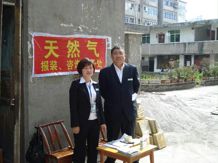 圖為通龍?zhí)烊粴夤痉⻊?wù)人員進(jìn)小區(qū)為用戶提供報(bào)裝、咨詢(xún)服務(wù)