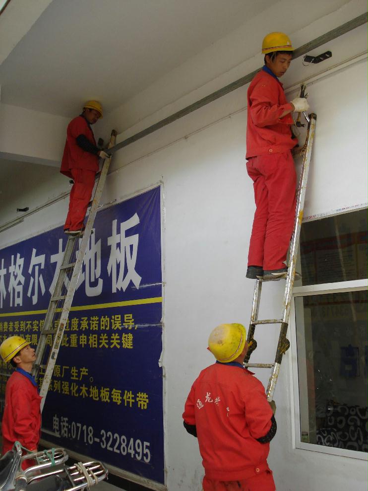 圖為4月17日通龍?zhí)烊粴夤景惭b人員在金鼎大廈安裝天然氣管道