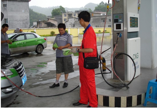 圖為CNG加氣員正在為出租車司機發(fā)放宣傳傳單